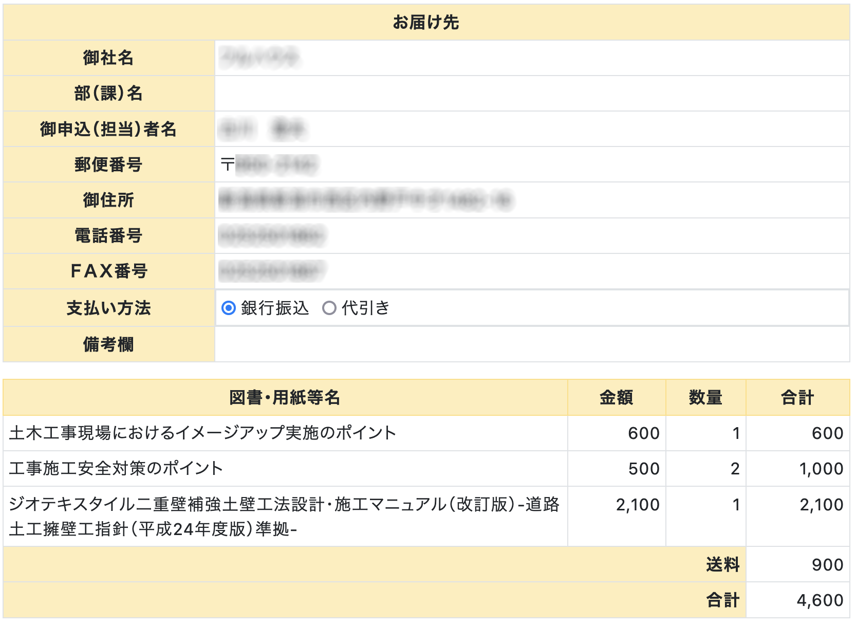支払い方法は、「銀行振込」と「代引き」の二種類があります。